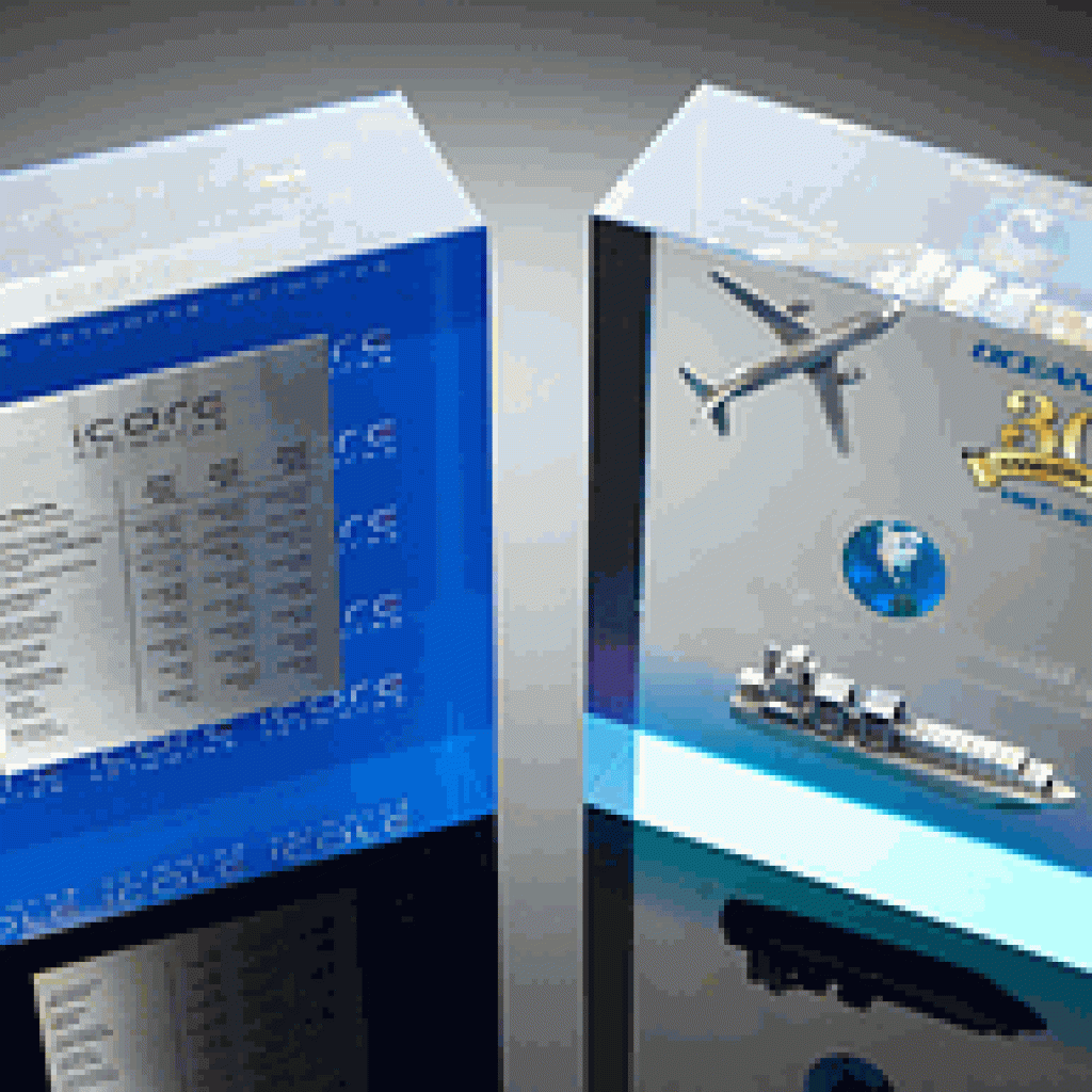 - Crystal-clear lucite casting that embeds logos, text, and 3D objects.