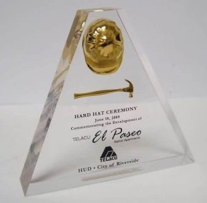 - Golden Hard Hats & Ceremonial Shovels → Mounted on Lucite bases or fully embedded for groundbreaking and safety awards.