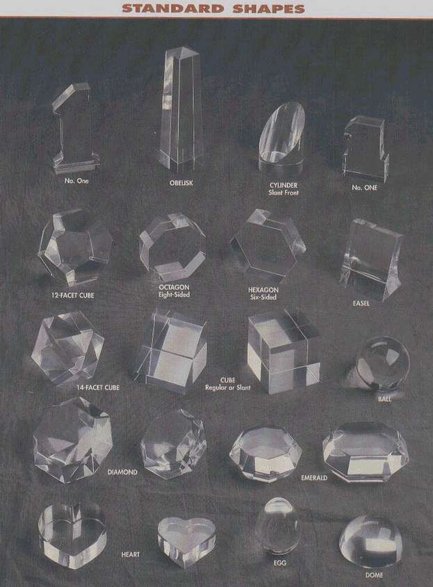 These standard shapes are available in many sizes. Once you have chosen the desired shape for your custom award, you must decide the approximate size needed and the artwork you want for the insert.