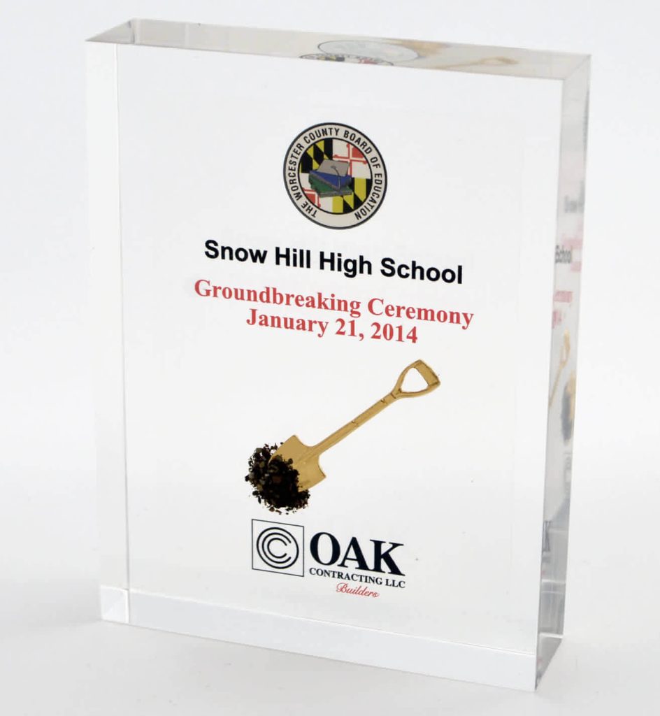 Every groundbreaking ceremony represents a unique project with its own story. For that reason, organizations prefer custom Lucite embedded shovel awards that highlight the project name, location, participants, and date of the ceremony.