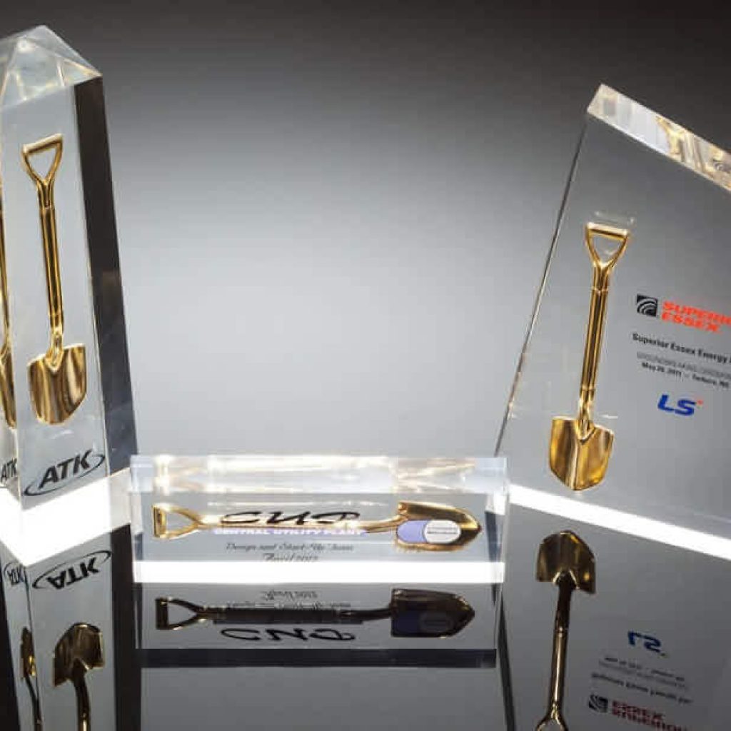 Custom Lucite Embedded Shovel Awards for Corporate and Construction Projects